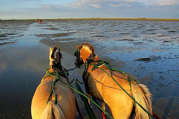 Mit erfahrenen Kutschern gelangen Sie per Pferd und Wagen durch die weltweit einzigartige Wattenmeerlandschaft des Nationalpark Schleswig-Holsteinisches Wattenmeer zur Hallig Südfall.